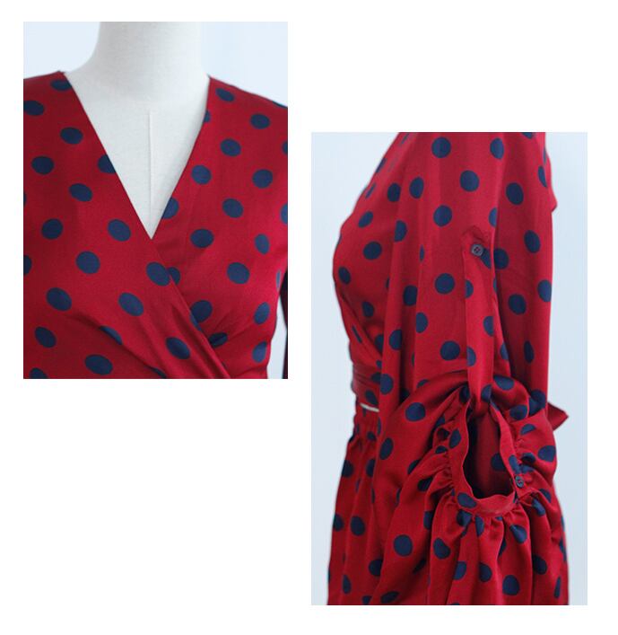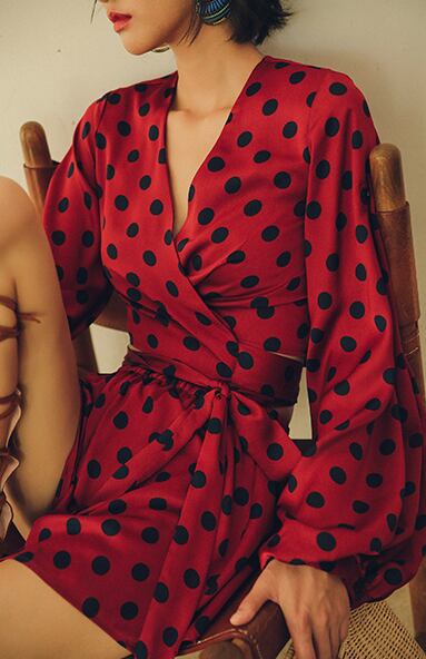 レッドとネイビーのドットがスタイリッシュなセットアップです。カシュクールのようなリボン付きブラウスがフレッシュな印象です。それぞれ単品でも幅広くスタイリングしやすいアイテムです。