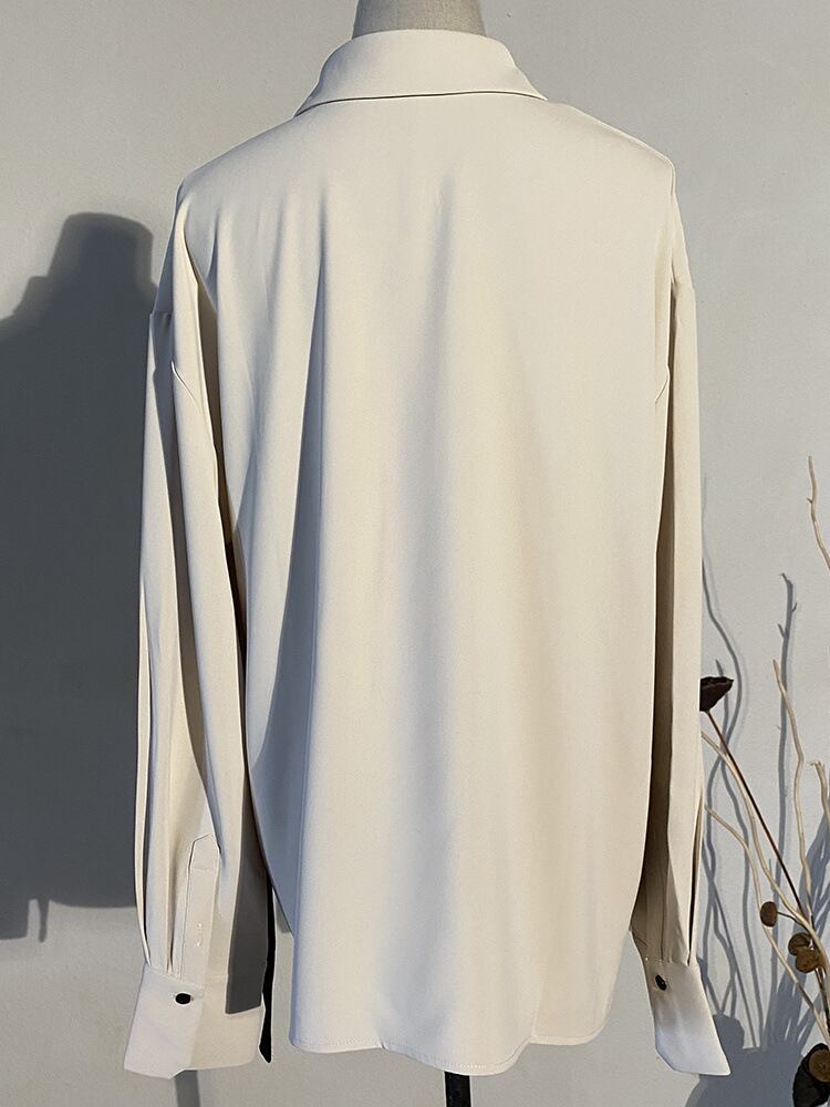 半分だけプリーツが入っているアシンメトリーデザインとフロントのブラックリボンがアクセントのシャツです。ニットなどを重ねて、裾のプリーツだけ見せても素敵です◎