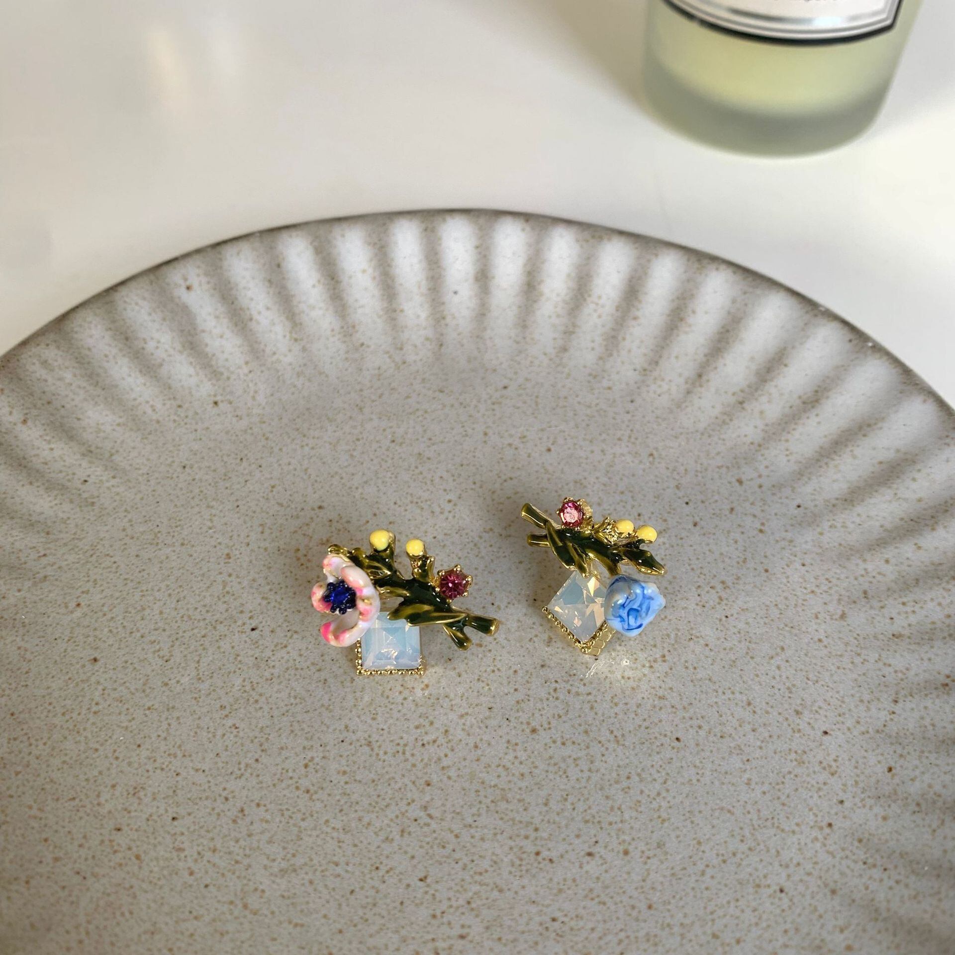 アンティークの陶器のような、お花がキュートなピアスです。色とりどりのお花をブーケにしたようなキュートなデザインで、顔まわりが明るく華やかに見えます。左右デザインが違うアシンメトリータイプです。プレゼントにもおすすめです。