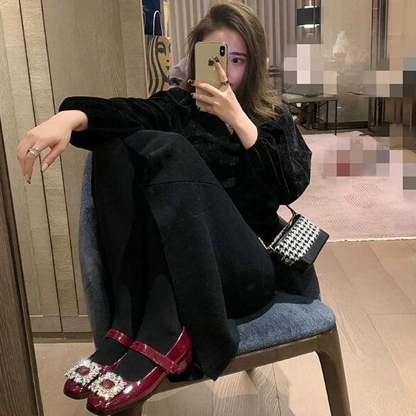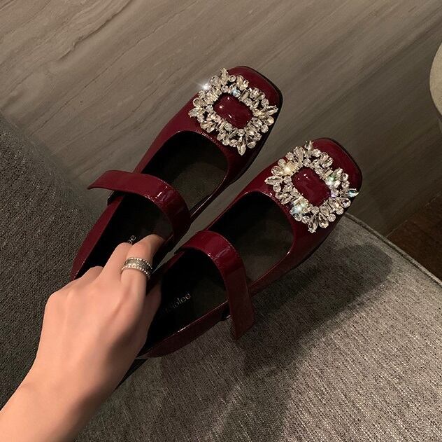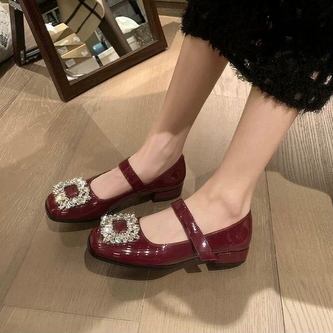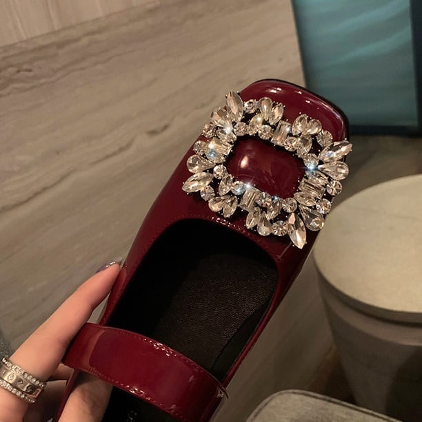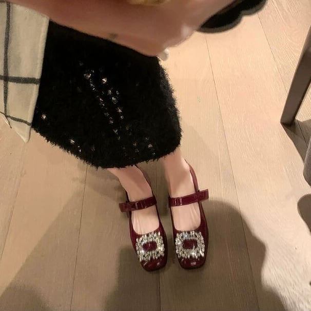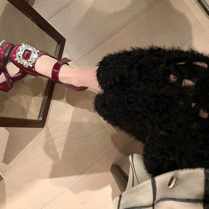 スクエアビジューがフェミニンなストラップパンプスです。パーティーファッションにおすすめの華やかなデザインです。高すぎないヒールとアンクルストラップで歩きやすさも◎です。