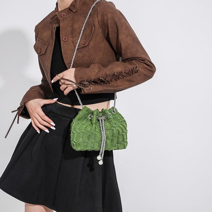 ヴィヴィッドなシャギーキャンバスとシルバーチェーン、パールチャームがスタイリッシュな巾着型のポシェットです。チェーンを2連にしてショルダーバッグとしても使用できます。