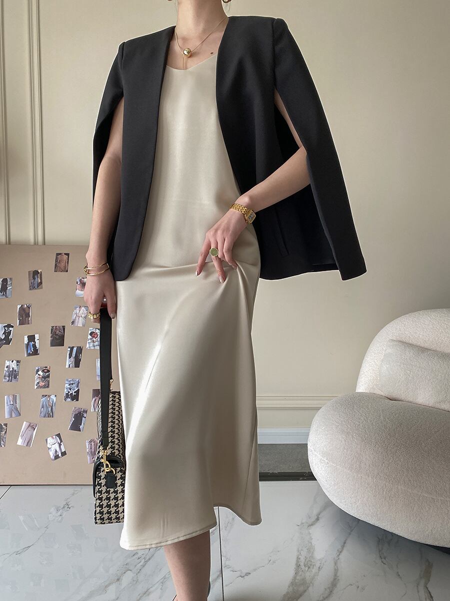 ケープにもなるノーカラージャケットです。ワンピースやパンツ、どんなボトムスにもよく似合います。1年を通して、幅広いスタイリングが可能なジャケットです。