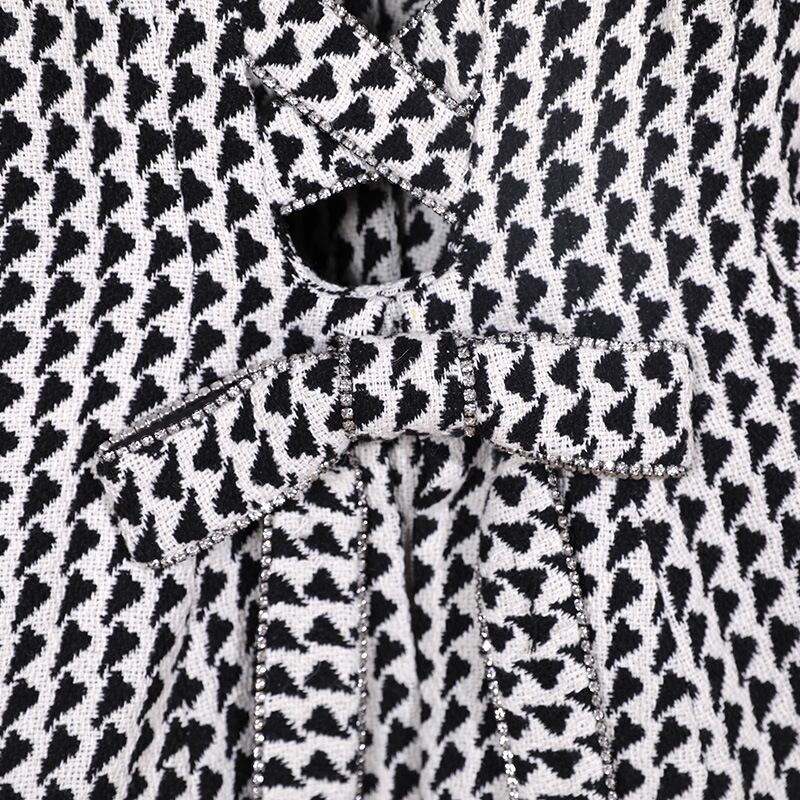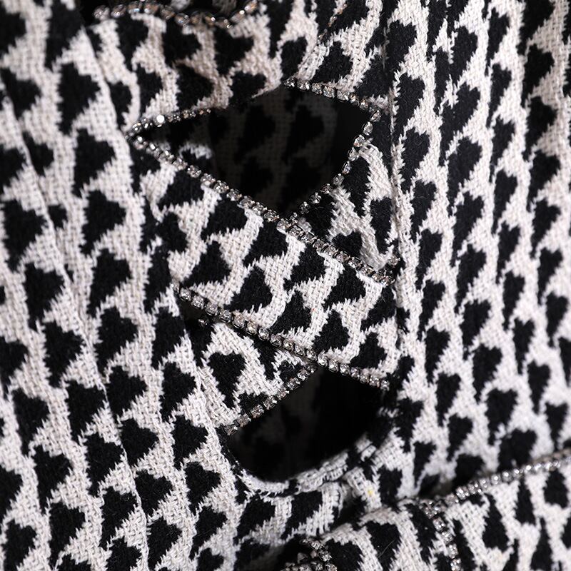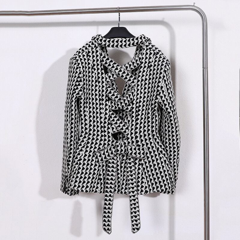 背中のレースアップが美しいグレンチェックのジャケットです。インナーのチョイス次第でカットアウトの印象がかわります。1枚でインパクトのあるスタイリッシュなスタイルが完成します。