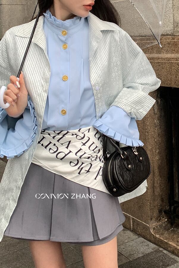 スタンドカラー フリルスリーブブラウス ライトブルー BL00078