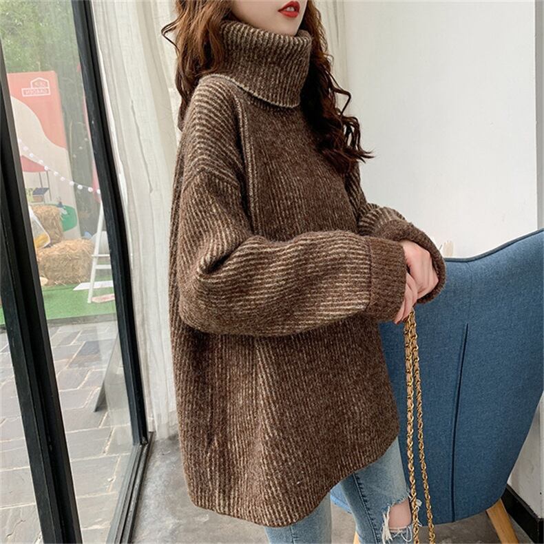 リブニットのタートルネックセーターです。特殊な編み方で生地が2色に見えるユニークなデザインです。ブルー、グリーン、オレンジ、ブラウンの4色展開です。