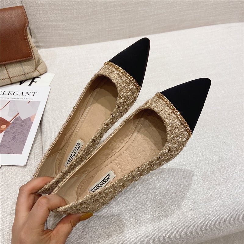 ツイードとの異素材コンビがフェミニンなフラットパンプスです。ゴールドチェーンのライニングもアクセントになっています。柔らかく歩きやすいのも◎、1年を通してお使いいただけます。