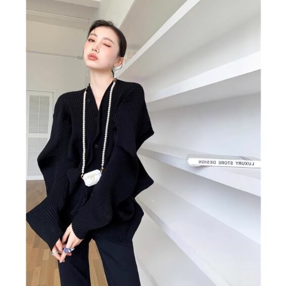ウエーブシルエット ニットカーディガン ブラック NI00110