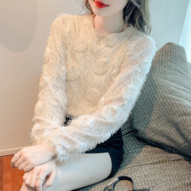 お花のデコレーションがフェミニンなシャギーニットです。女性らしいエレガントでソフトな雰囲気に仕上がります。スニーカーやデニムでカジュアルに仕上げるのもおすすめです。