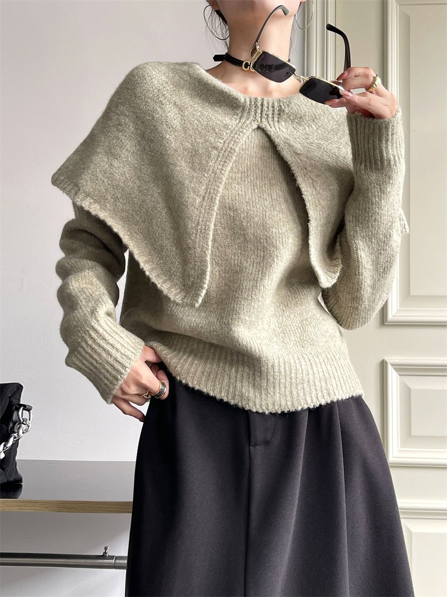 ケープのようなワイドカラーがポイントのニットです。落ち着いたライトカーキでスタイリッシュな印象に仕上がります。パンツ、スカート、どんなボトムスにもよく似合います。