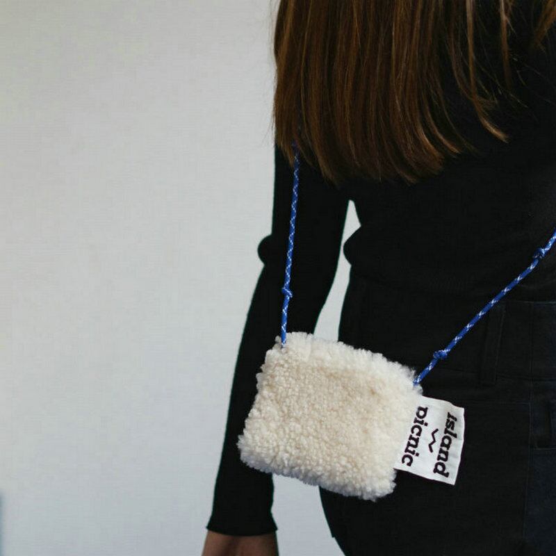 シアリングの質感と大きめタグがポイントのポシェットです。アイボリーにキャンプロープのような青いコードがよく映えます。1年を通して幅広いコーデのアクセントにおすすめです。