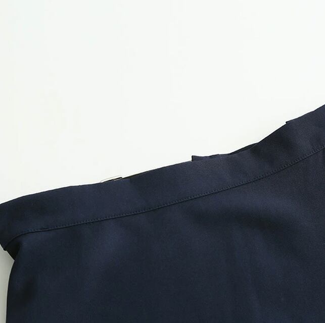 プリーツの切替がポイントのラップスカートです。ウエストのダブルバックルベルトがアクセント。どんなトップスにも合わせやすいシンプルなデザインです。通勤コーデにも使える、スタイリングしやすいスカートです。