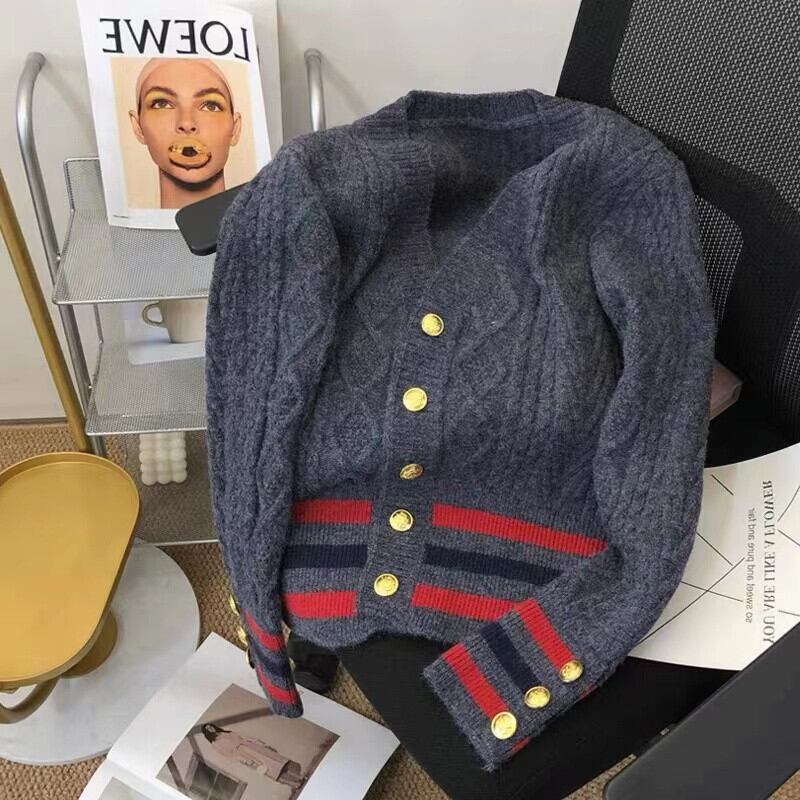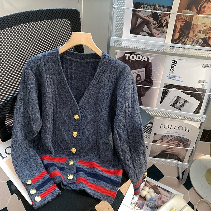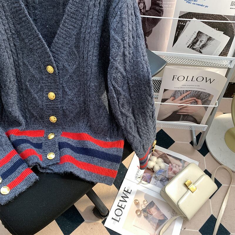 ケーブル編みとマルチボーダーがポイントのカーディガンです。フロントと袖口のゴールドボタンもアクセントになっています。どんなボトムスにも合わせやすいスタイリッシュなデザインです。