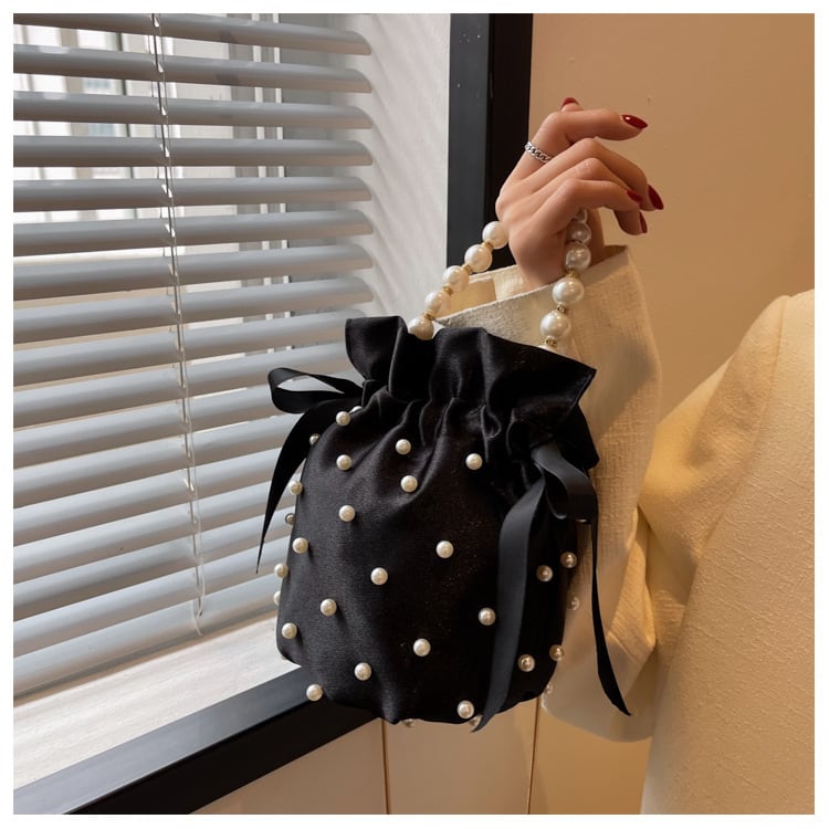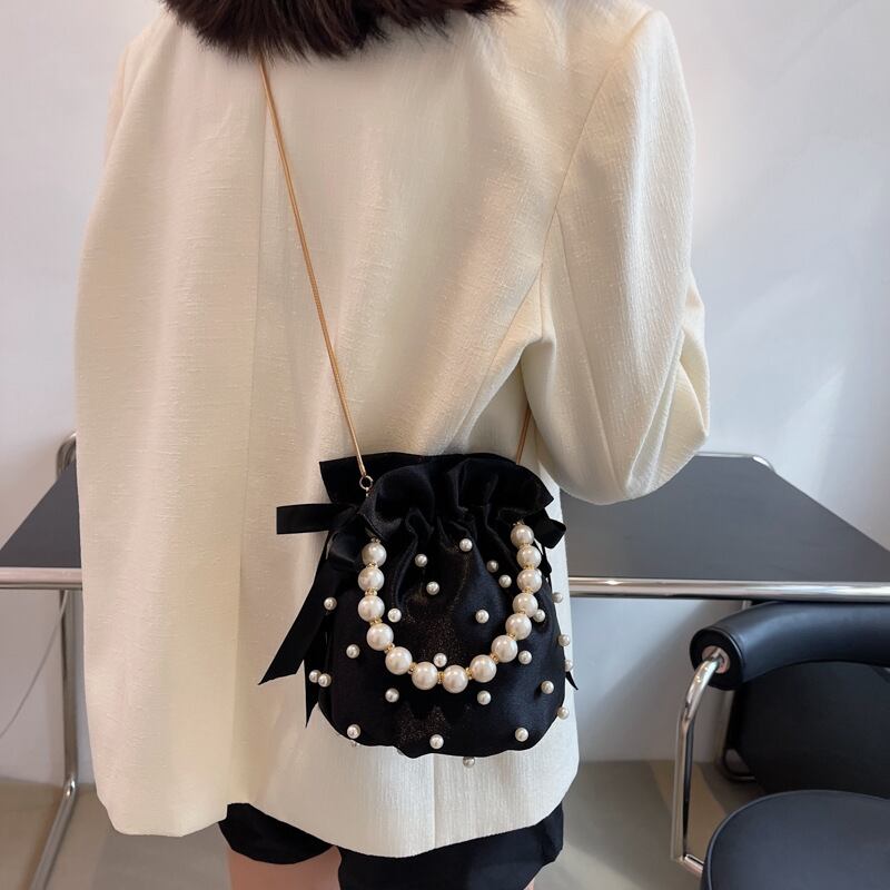 パールデコレーションがフェミニンな巾着型ハンドバッグです。ストラップをつけてポシェットとしてもお使いいただけます。パーティーバッグとしてもおすすめです。