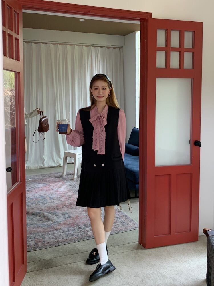リボンブラウスとジャンパースカートのセットアップです。レースのリボンやプリーツスカート、ダブルボタンなど、細かいところまでフェミニンでクラシカルなデザインです。単品でも幅広いスタイリングに活躍する使いやすいアイテムです。