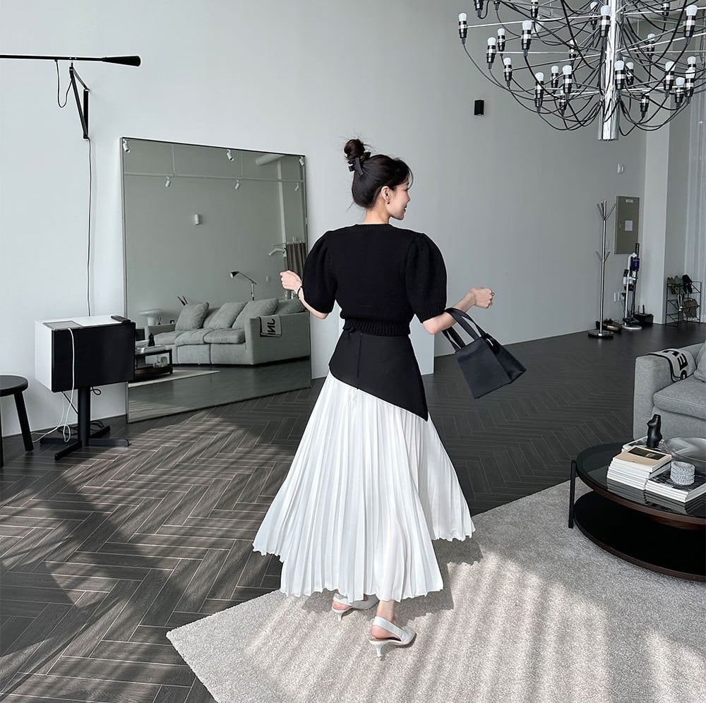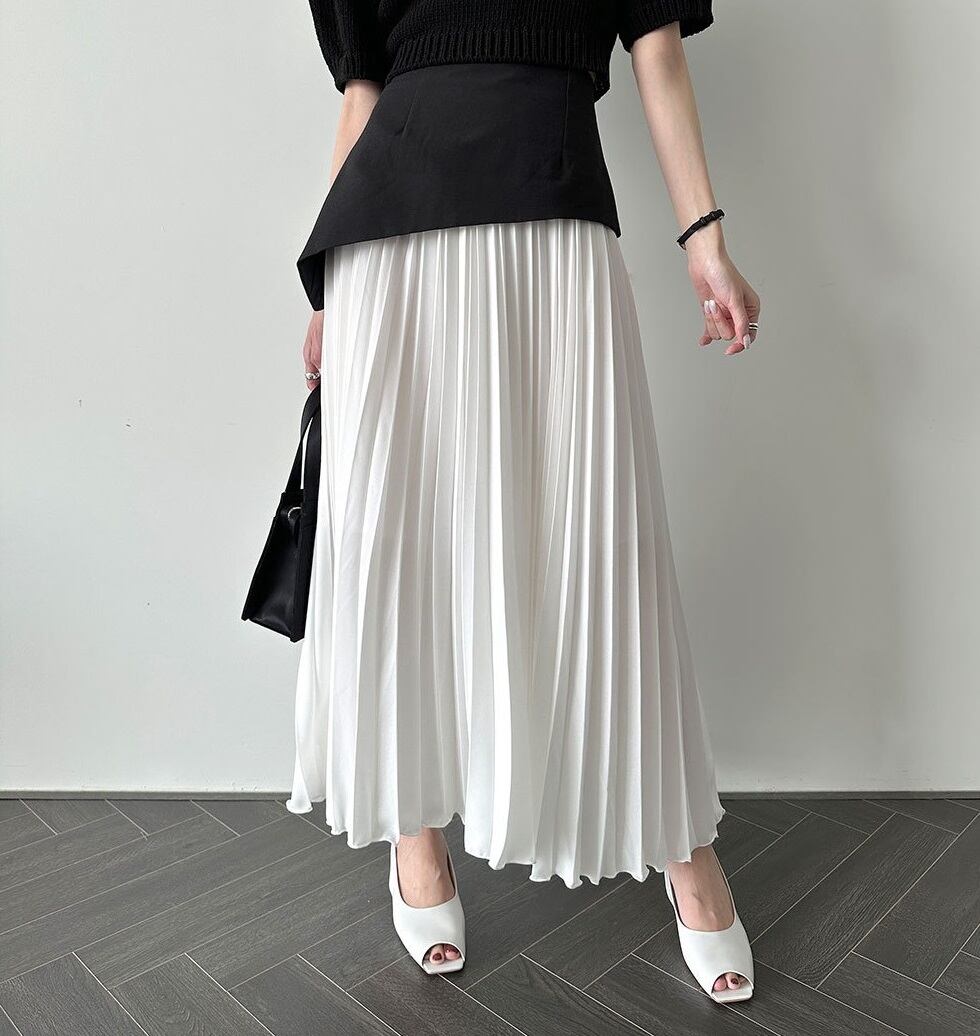 スイッチングプリーツ ロングスカート ブラック/ホワイト SK00078