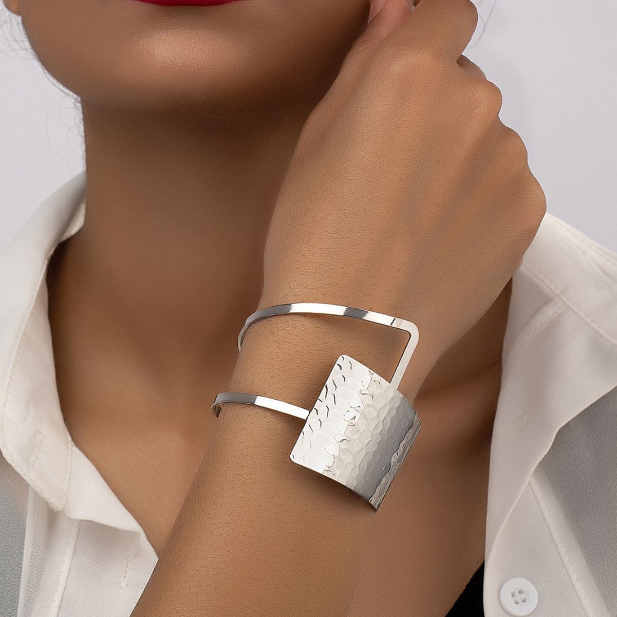 抽象的なアートのようなメタルバングルです。魚の鱗のようなエンボスがユニークなデザインです。1年を通して、幅広いスタイルのアクセントにおすすめです。