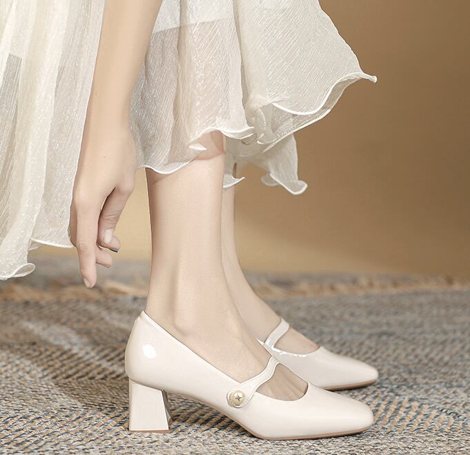 アンクルストラップのヒールパンプスです。フェミニンなエナメル素材とパールボタンがアクセント。台形の低めのヒールで長時間履いても歩きやすいです。パンツ、スカート、どんなボトムスにもよく似合います。