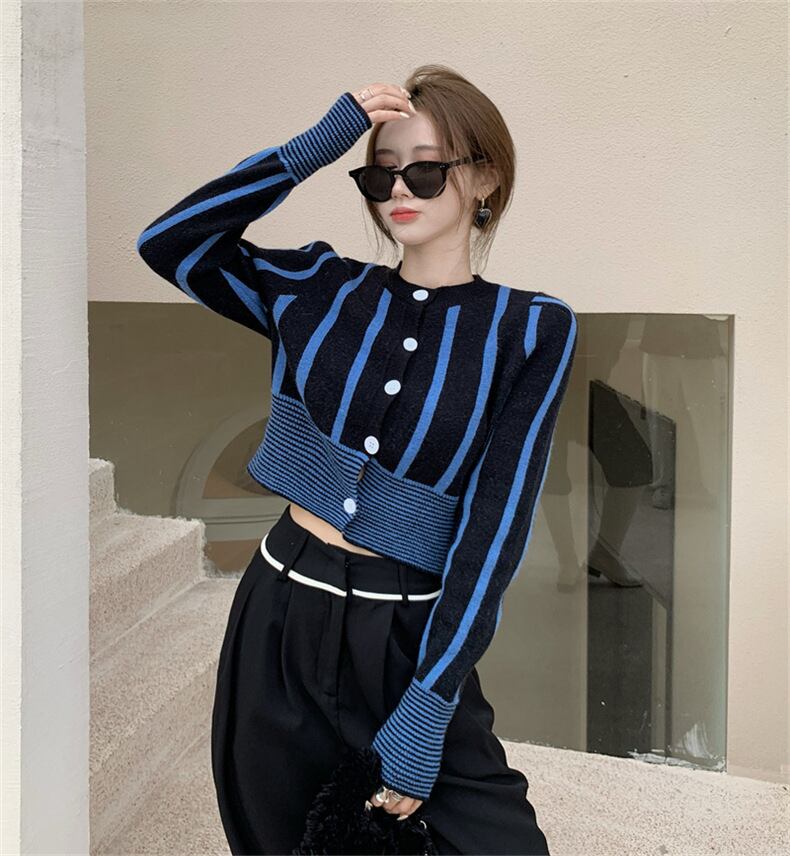 バイカラーのストライプがスタイリッシュなカーディガンです。袖口とウエストのワイドリブでメリハリのあるシルエットが完成します。ユニークな2色の組み合わせで個性的なスタイルに仕上がります。どんなボトムスにも合わせやすいデザインです。
