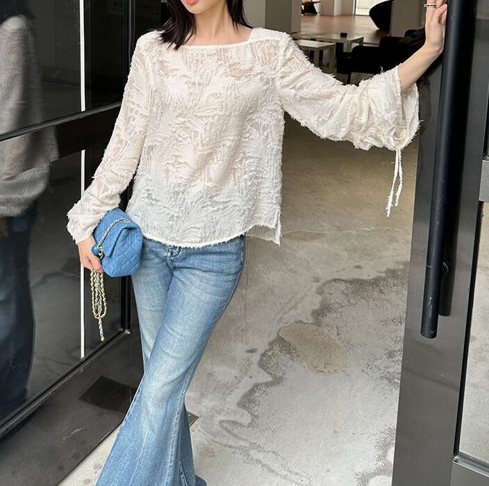透かし編みニットのようなレースのカットソーです。袖口のストラップを調整してシャーリングが楽しめます。デニムやスニーカーと合わせてもフェミニンに仕上がります。