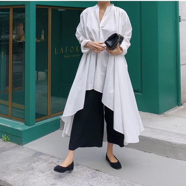 アシンメトリーなスタンドカラーのロングシャツです。メリハリがあり、動きのあるフレッシュなイメージに仕上がります。ワンピースなどとのレイヤードスタイルもおすすめです。カジュアルからエレガントスタイルまで幅広くお使いいただけます。