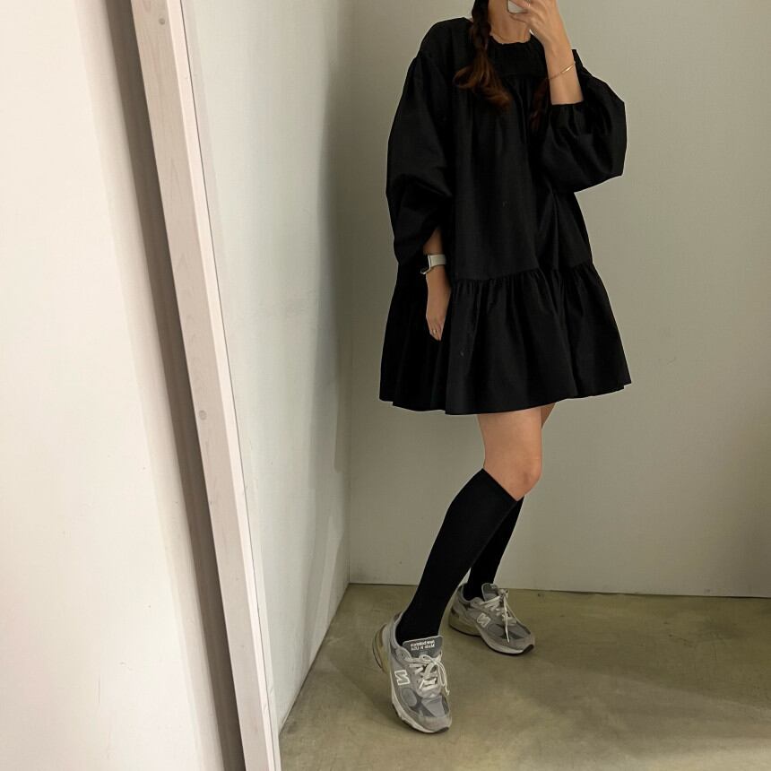 ランタンスリーブとフリルがフェミニンなワンピースです。女性らしいふんわりとした雰囲気に仕上がります。ブーツでもスニーカーでも幅広いスタイリングが楽しめます。