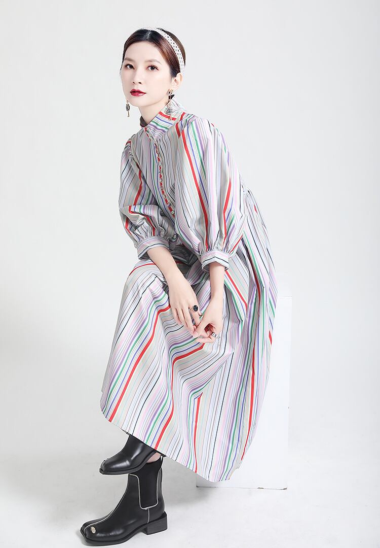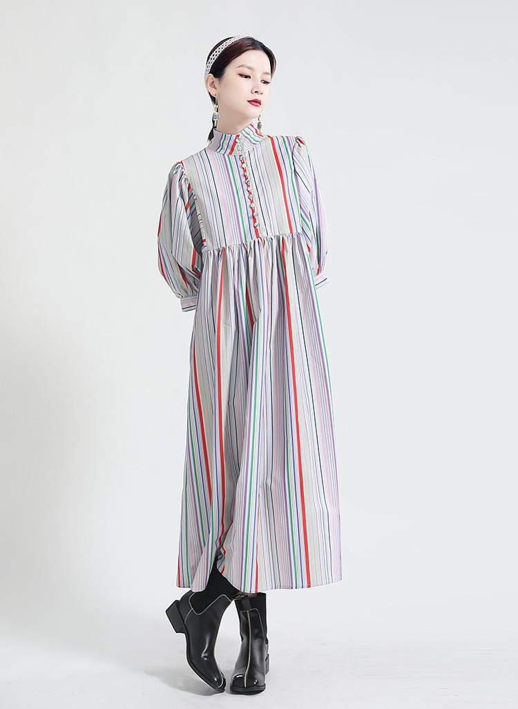 スタンドカラーがポイントのマルチストライプのワンピースです。スタンドカラーやスリーブなど細かいところまでスタイリッシュ。1年を通して、幅広いスタイリングが楽しめます。