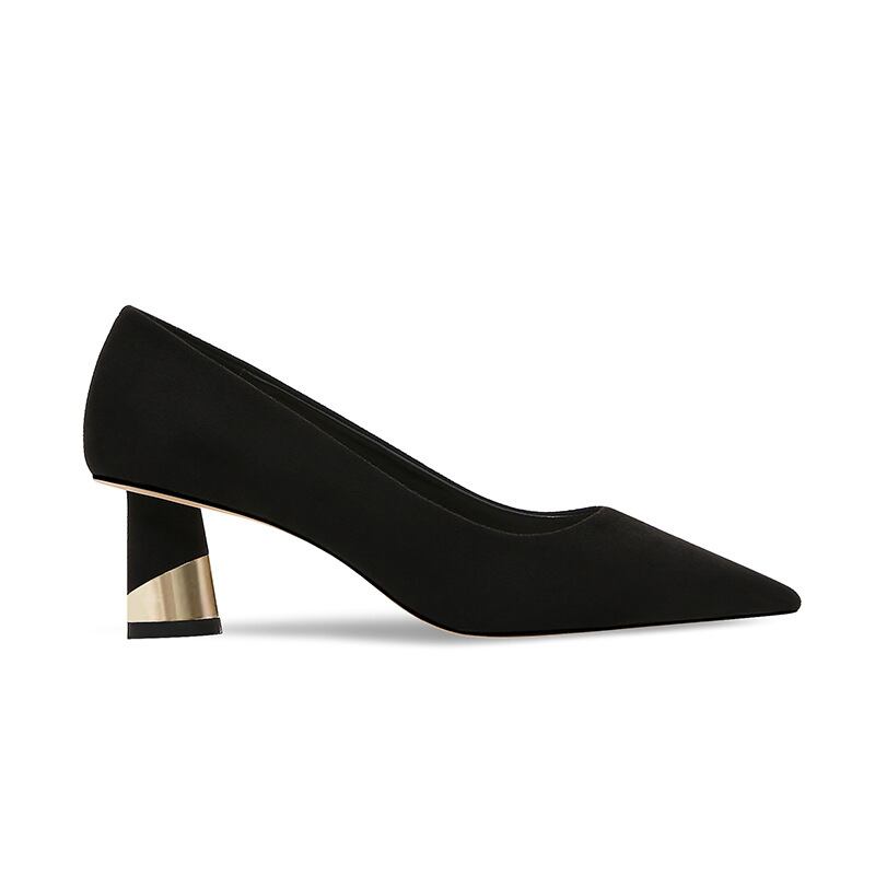 ゴールドのデザインヒールがポイントのパンプスです。ポインテッドトゥと繊細なヒールのデザインがエレガント。安定したヒールで長時間履いても歩きやすい点も◎です。パンツ、スカート、どんなボトムスにもよく似合います。