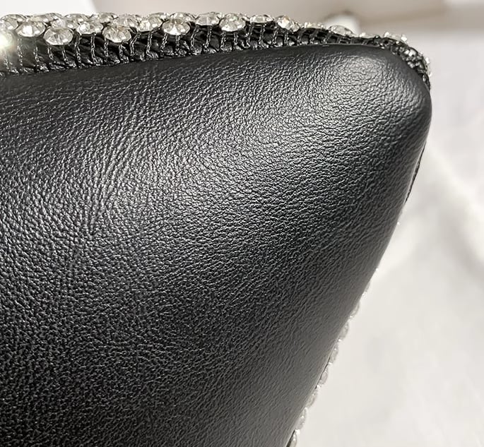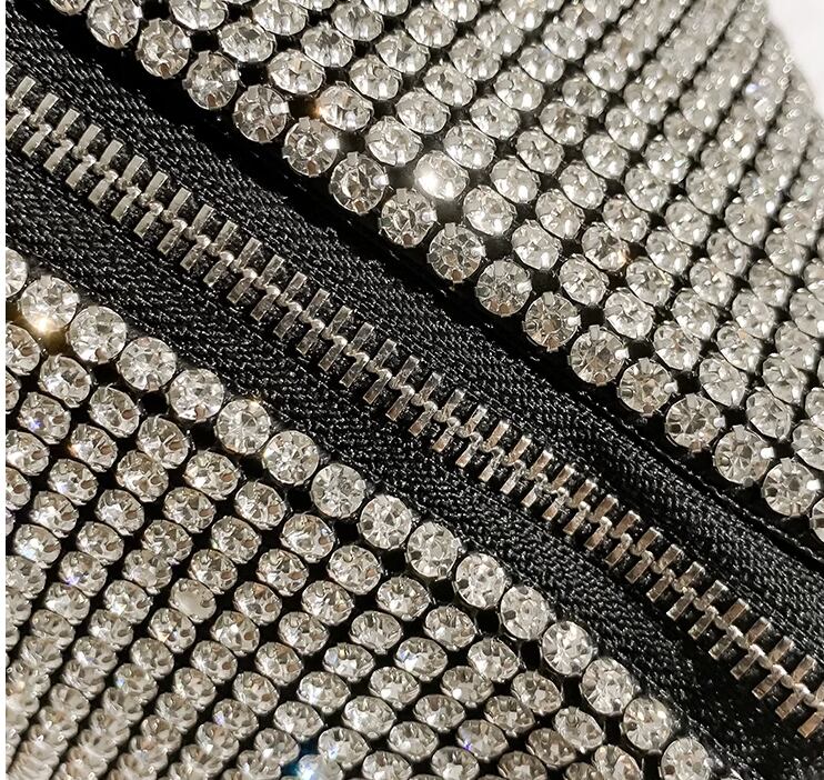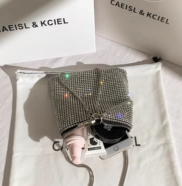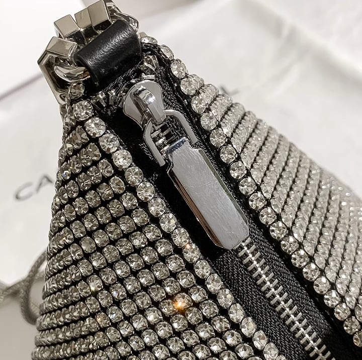 オールビジューがゴージャスなトライアングルバッグです。チェーンストラップをつけて肩掛けもできます。パーティーファッションのアクセントにおすすめのバッグです。