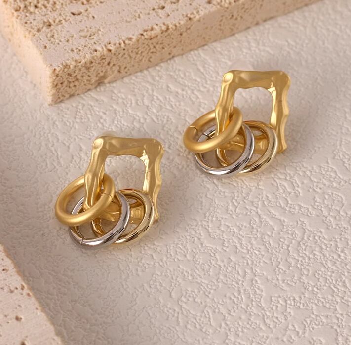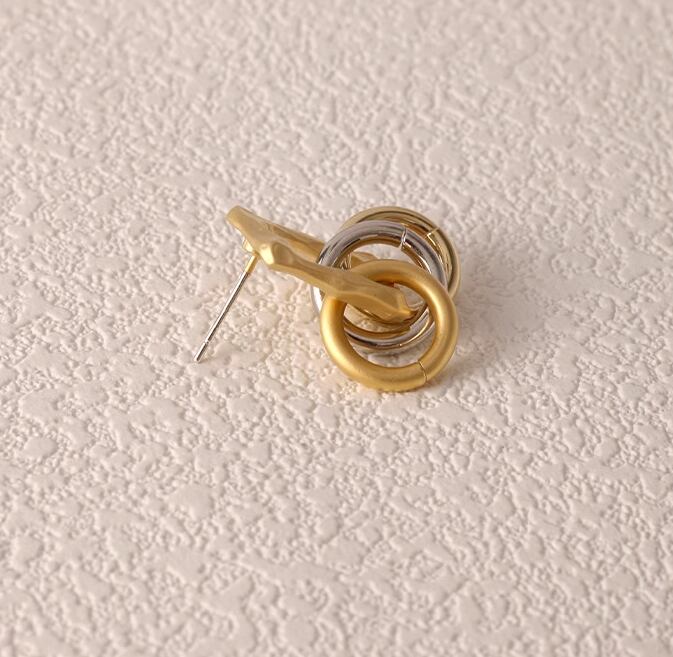 フレームとマルチリングをミックスしたアートのようなピアスです。額縁のようなマットゴールドのフレームに3色のリングが並ぶ、ユニークなデザインです。フレッシュな印象に仕上がります。スーツやジャケットなど、マニッシュなスタイルに良く似合います。
