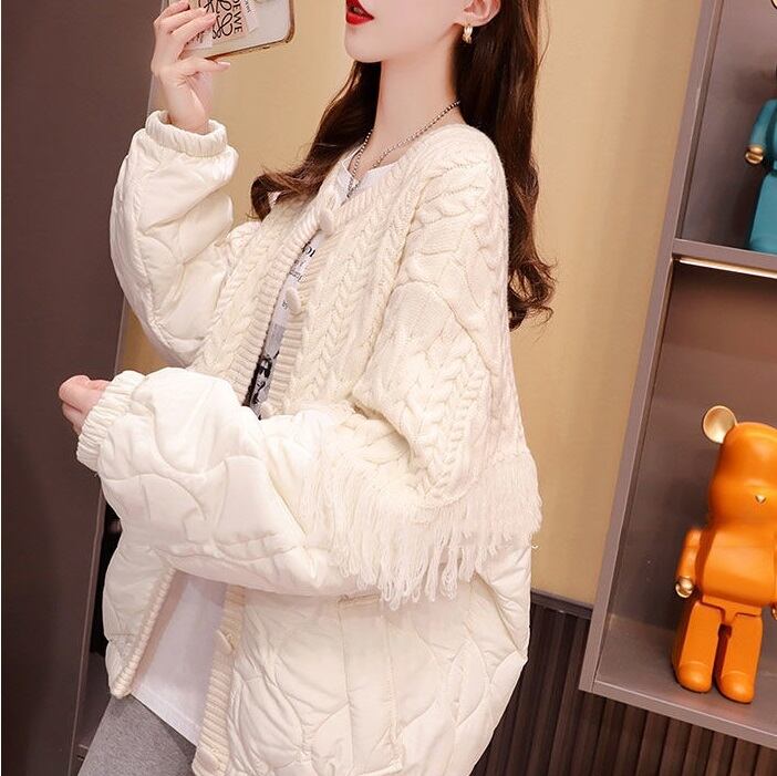 ニットとキルティングのコンビがスタイリッシュなコートです。ケーブルニットのトリミングに入ったフリンジがアクセント。腰まで隠れ、温かく、スタイリングもしやすい長さです。カジュアルにもフェミニンにもスタイリングが可能です◎