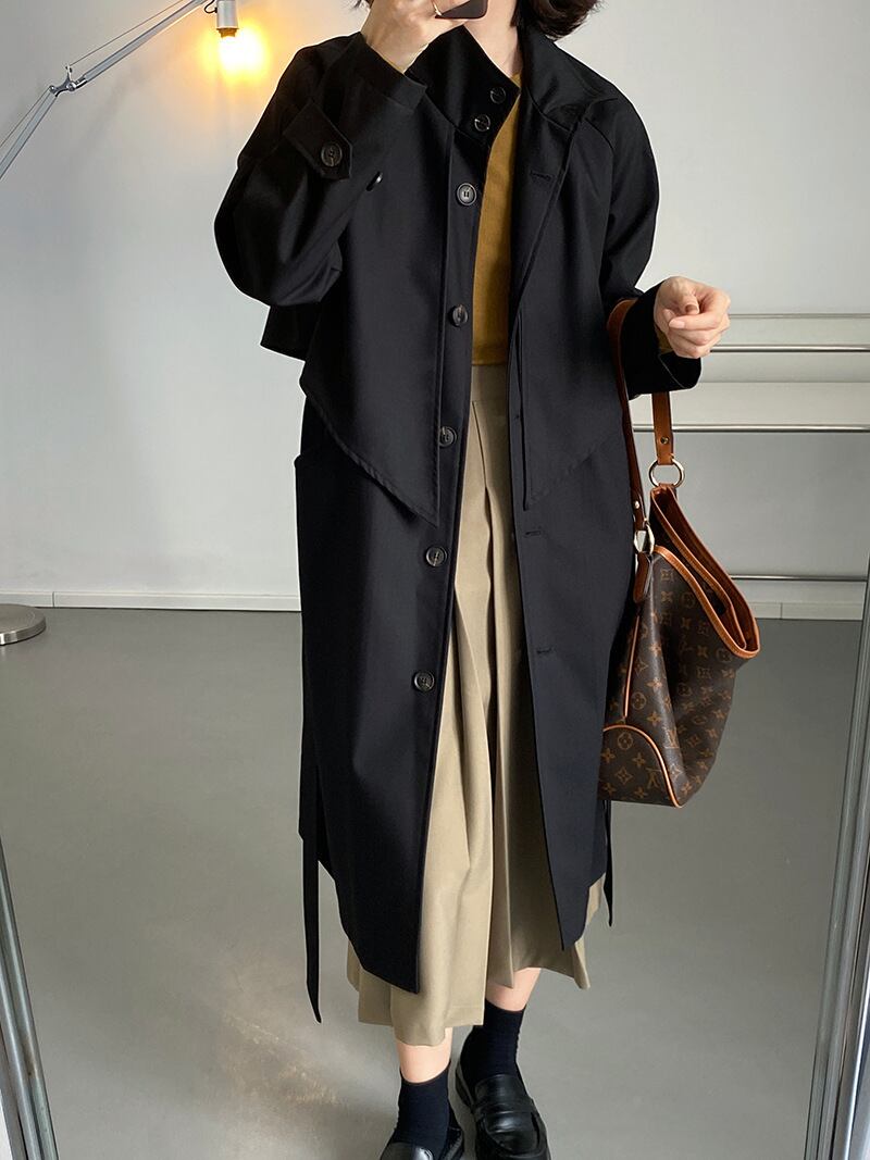 比翼のデザインがユニークなトレンチコートです。スタンドカラーや袖のボタン、比翼の後ろに並んだボタンなど、細部までスタイリッシュなデザインです。ウエストベルトでシルエットの調整が楽しめます。お仕事でもプライベートでもシーンを選ばず着用できます。秋冬のムードにぴったりのスタイリッシュなコートです。