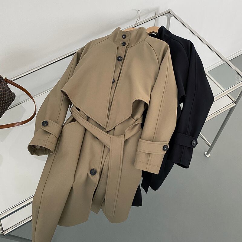 比翼のデザインがユニークなトレンチコートです。スタンドカラーや袖のボタン、比翼の後ろに並んだボタンなど、細部までスタイリッシュなデザインです。ウエストベルトでシルエットの調整が楽しめます。お仕事でもプライベートでもシーンを選ばず着用できます。秋冬のムードにぴったりのスタイリッシュなコートです。