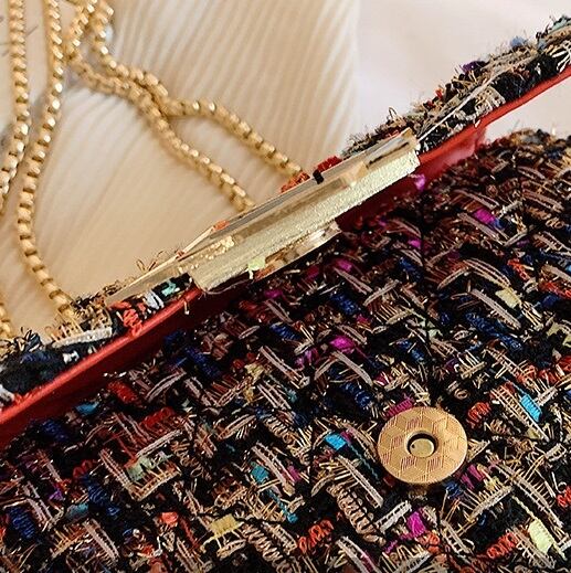 ミックスツイードのチェーンポシェットです。ミックスツイードとエッジーなメタルパーツがアクセント。チェーンを2連にしてショルダーバッグとしても使用できます。秋冬のスタイルをセンスアップするオススメのバッグです。