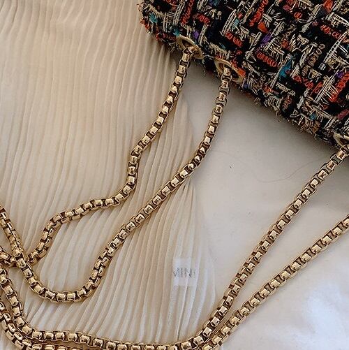 ミックスツイードのチェーンポシェットです。ミックスツイードとエッジーなメタルパーツがアクセント。チェーンを2連にしてショルダーバッグとしても使用できます。秋冬のスタイルをセンスアップするオススメのバッグです。