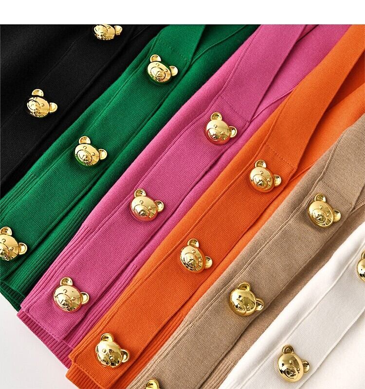 テディベアのゴールドボタンがポイントのカーディガンです。肌ざわりの良い薄手の素材で、スタイルアップできるデザインです。ボトムスを選ばず、幅広いコーディネートによく似合います。空調の効いたオフィスなどでも使いやすいカーディガンです。カラーバリエーションは6色!お気に入りの1枚が見つかります。
