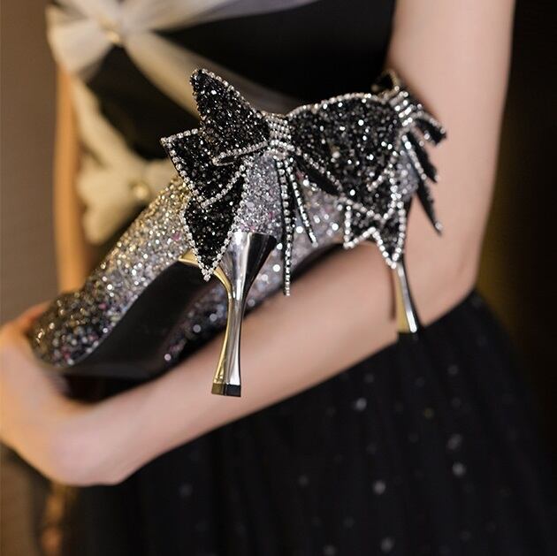 バックリボン グリッターヒールパンプス ブラック/シルバー SH00137