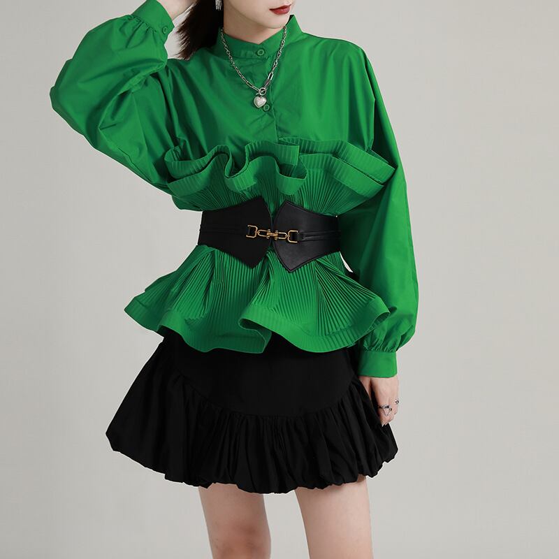 スタンドカラー ハイウエストフリルブラウス(ベルト付き)グリーン BL00112