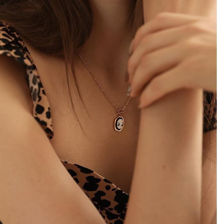 カメオ風のチャームがポイントのゴールドネックレスです。バックルでチェーンを留めるフレッシュなデザインです。幅広いコーディネートのアクセントにおすすめです。