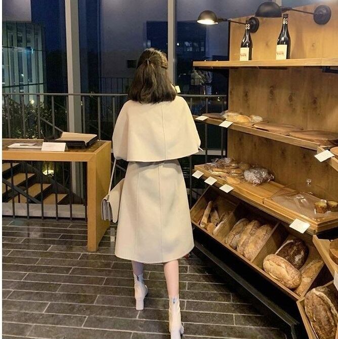 ウールジャケットとジャンパースカートのツーピースです。セットで着用するとフェミニンな雰囲気に仕上がります。ケープ調のジャケットはカジュアルにもスタイリングが可能です。ジャンパースカートはブラウスやニットと合わせるのがオススメ☆それぞれのアイテムが個別にも活躍するツーピースです。