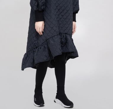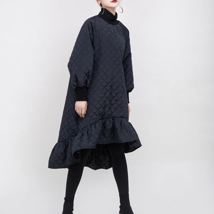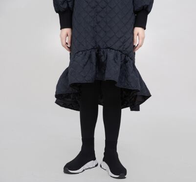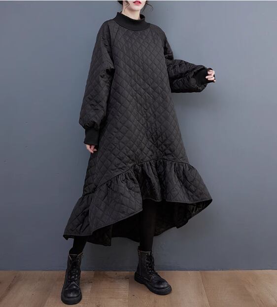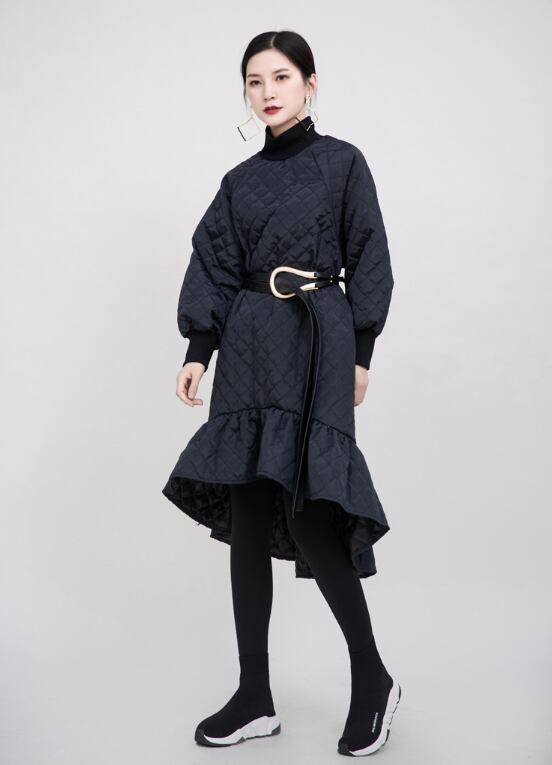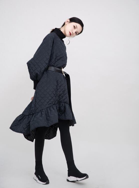 マーメイドシルエットのキルティングワンピースです。前後でアシンメトリーな着丈や裾のワイドフリルなど、メリハリのある美しいシルエットに仕上がります。キルティング+袖や首元のリブで防寒もパーフェクト。ベルトでウエストマークするのもおすすめです。
