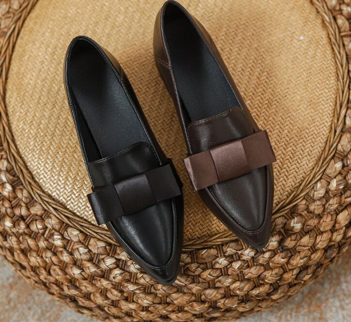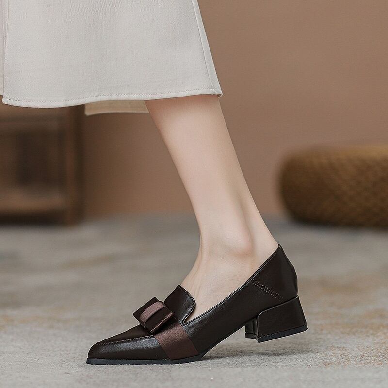 リボンがポイントのヒールパンプスです。ポインテッドトゥと異素材ミックスがスタイリッシュ。どんなコーディネートにも似合うシンプルなデザインです。安定した4cmのブロックヒールで歩きやすさも◎です。