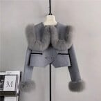 エコファーの衿と袖がポイントのショートジャケットです。エレガントにも、カジュアルにもどちらにも良く似合います。ボトムスを選ばず、幅広いコーディネートが楽しめます。