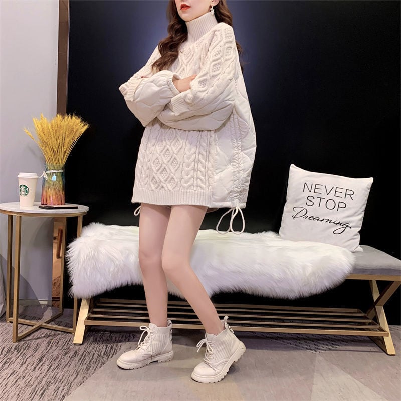 ケーブルニットとキルティングのコンビネーションニットです。ユニークな異素材ミックスがハイセンスなデザインです。裾のコードストリングでシルエットをアレンジできます。キルティング素材とニットで寒い季節も温かく過ごせます。パンツでもスカートでも、トレンド感のあるコーデが楽しめます◎