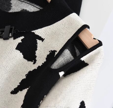 モノトーンモチーフがスタイリッシュなニットです。首まわりについたブラックのチェーンと肩口のカットアウトがアクセント。ランタンスリーブできれいなシルエットが完成します。個性あふれるインパクトのあるニットです。パンツでもスカートでもどちらでもスタイリングが楽しめます。チェーンは取り外しができます。