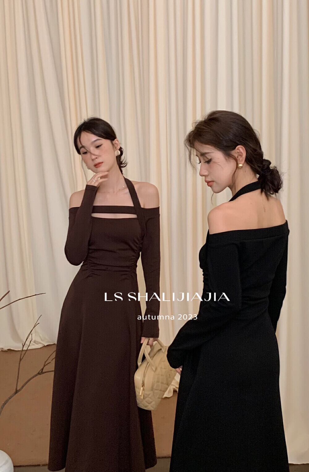 ストラップアレンジがエレガントなオフショルダーワンピースです。ホルターネックとオフショルダーをミックスしたエレガントなデザインで、品のある肌見せが可能です。ジャケットやニットのインナーとしても、幅広いスタイリングが楽しめます。大切な記念日やパーティーにおすすめのワンピースです。