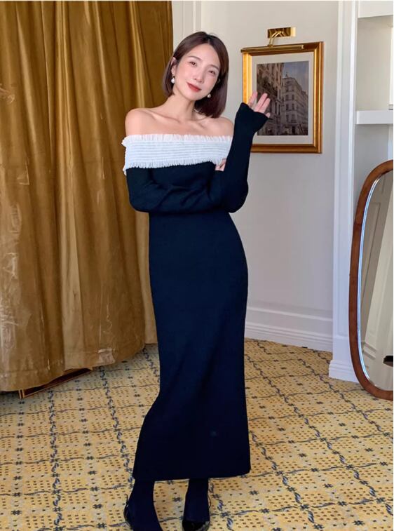 シャーリングフリル オフショルダーニットドレス ブラック OP00166