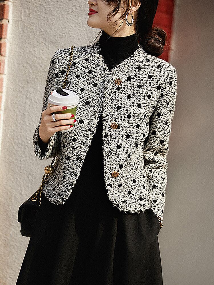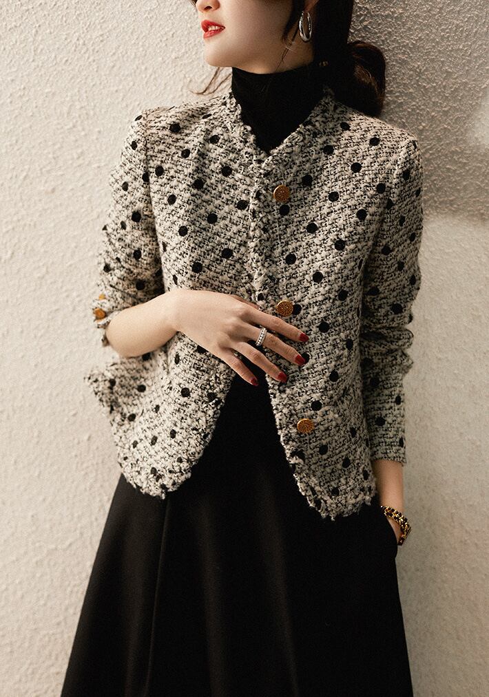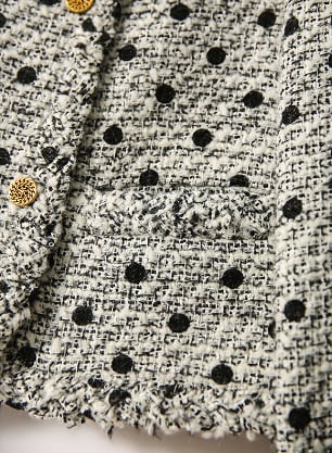 グレーの水玉がフェミニンなノーカラーツイードジャケットです。品のあるゴールドボタンや、衿から裾にかけてのシャギーアレンジなど、ディティールにもこだわったデザインです。デニム+スニーカーコーデに合わせても、スカートとヒールパンプスと合わせても、幅広いスタイリングが楽しめます。