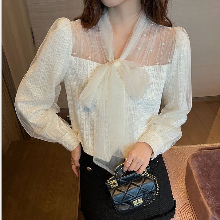 シアー+レース レイヤード リボンブラウス アイボリー BL00125