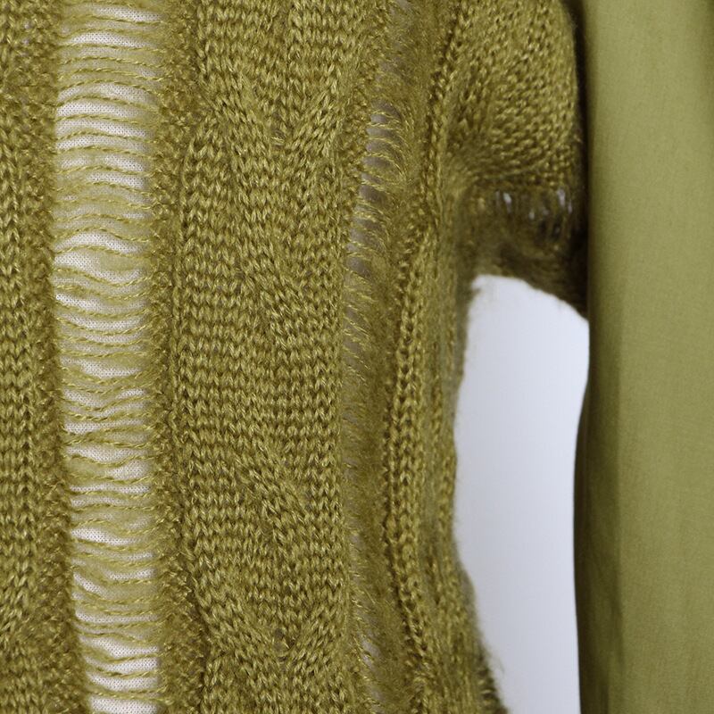 メッシュ編みの入ったニットのボディーにコットンスリーブをミックスしたトップスです。ニットの透け感とコットンスリーブのボリューム感のコントラストがユニークなデザインです。透け感を活かして、インナーのアレンジも楽しめます。エコレザーやメタリックなどユニークな素材との相性も◎です。