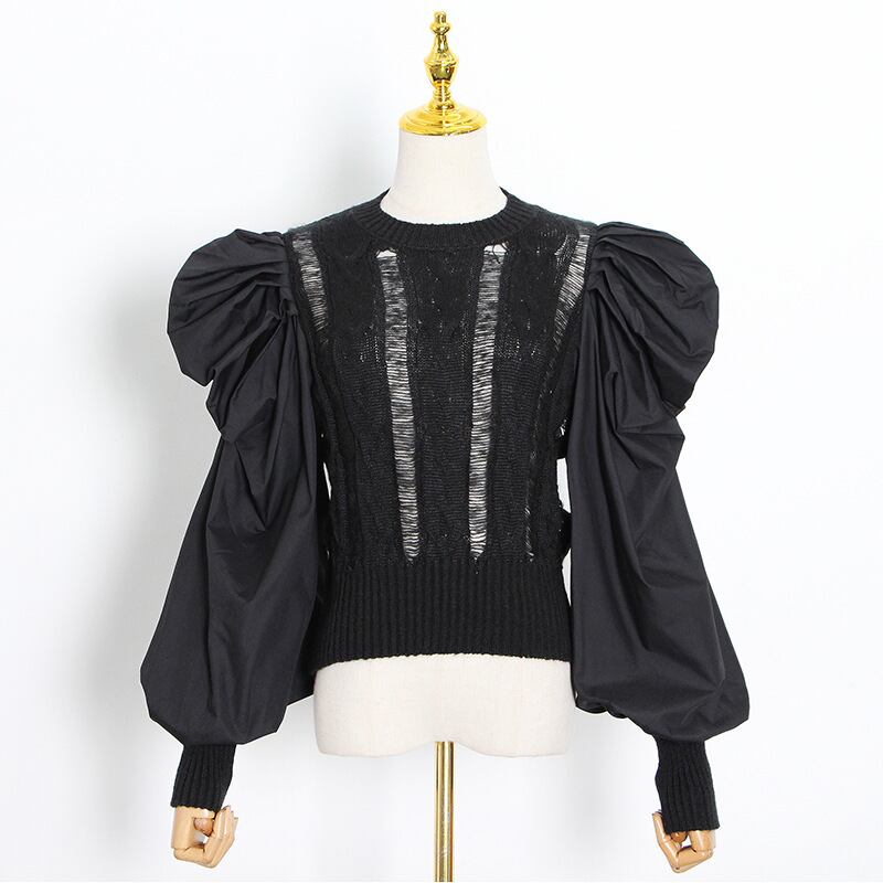 コットンパフスリーブ メッシュニットトップス ブラック CS00073
